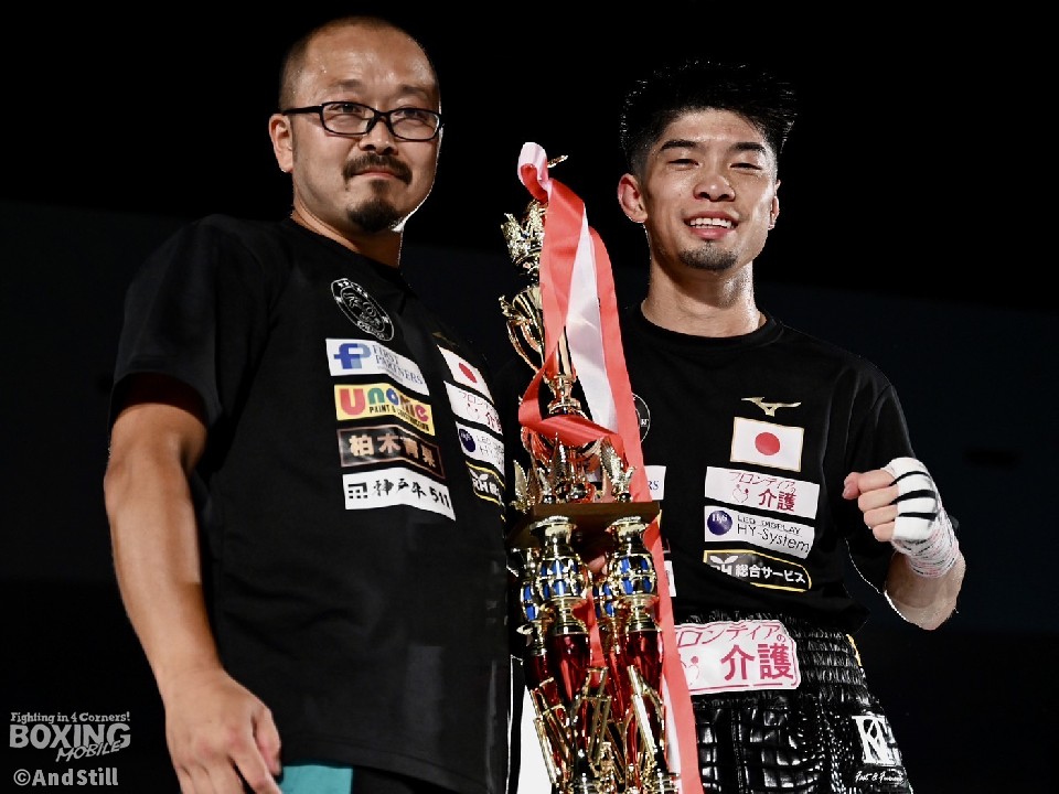 畑中清詞会長は「カリージョは、よく頑張ったね。ここまで頑張るとは思わなかった。恒成は、大輔(写真:左/村田大輔トレーナー)と取り組んできたことを出せたのではないか。10ラウンドやって、いろいろなことを試せたのが良かった」と、田中のパフォーマンスに合格点を与えた。