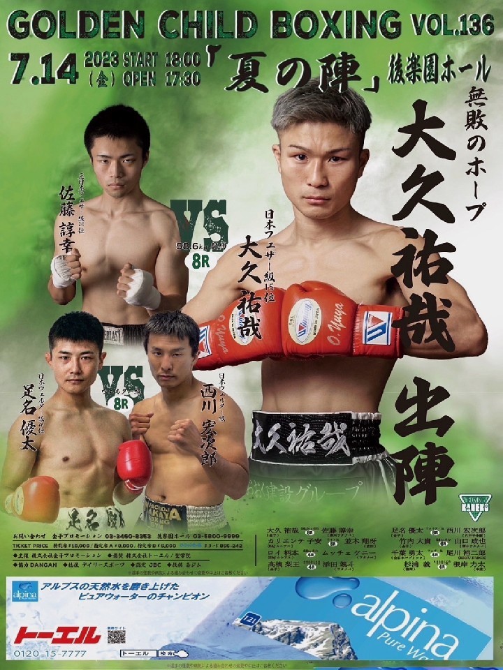 明日は、ウェルター級8回戦に日本スーパーウェルター級4位の足名優太(29=金子)が登場。WBO-APウェルター級チャンピオンの佐々木尽(21=八王子中屋)と同門の、西川宏次郎(34=八王子中屋)と対戦する。