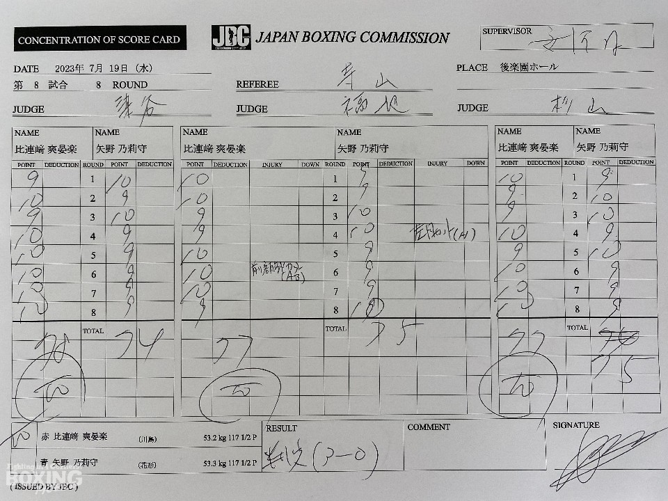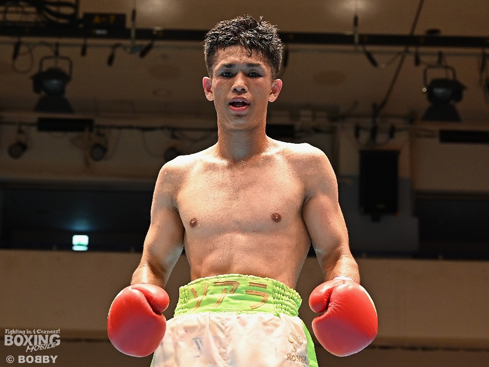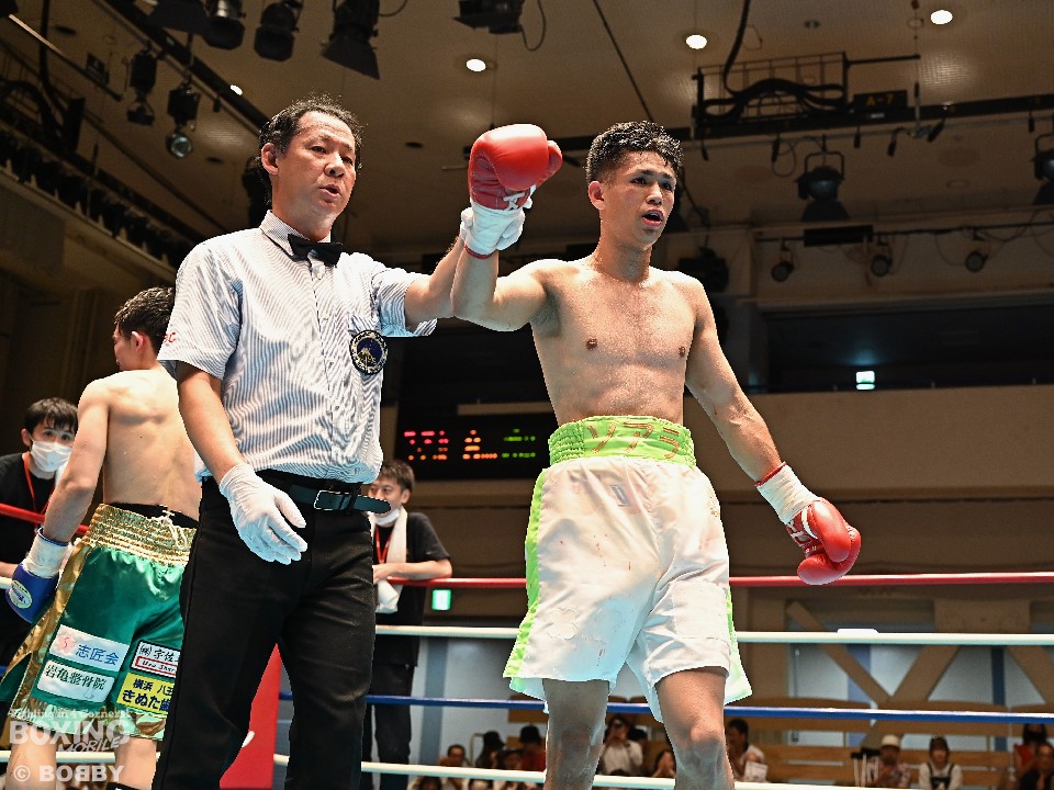 序盤は、ジャブの差し合いで静かなスタート。3回、矢野がプレスをかけてワンツーをヒットすると、比連アは4回に右ストレートで左目上を切り裂いた。前半を折り返して五分五分の展開だった。比連アがハッキリとペースを掴んだのは6回。前に出てきた相手に対し、右ショートアッパーでグラつかせると、7〜8回も攻勢を印象付けた。