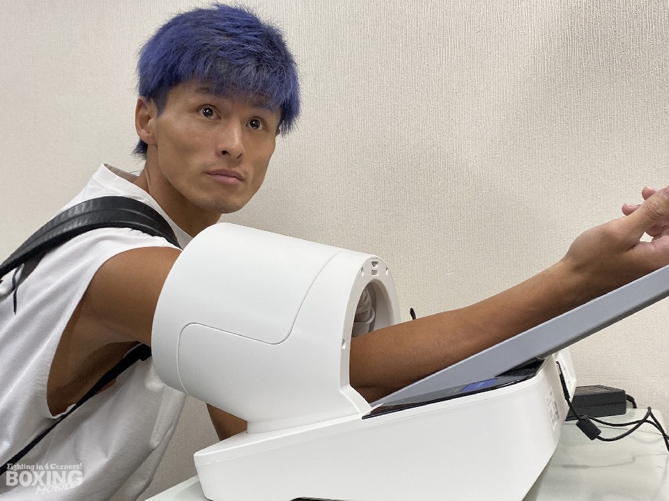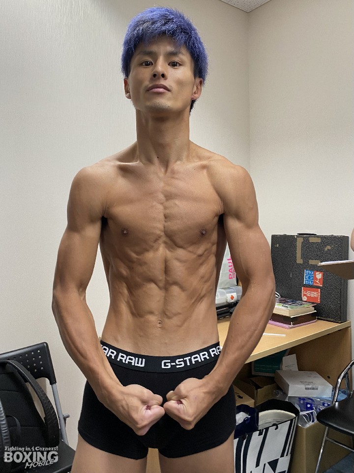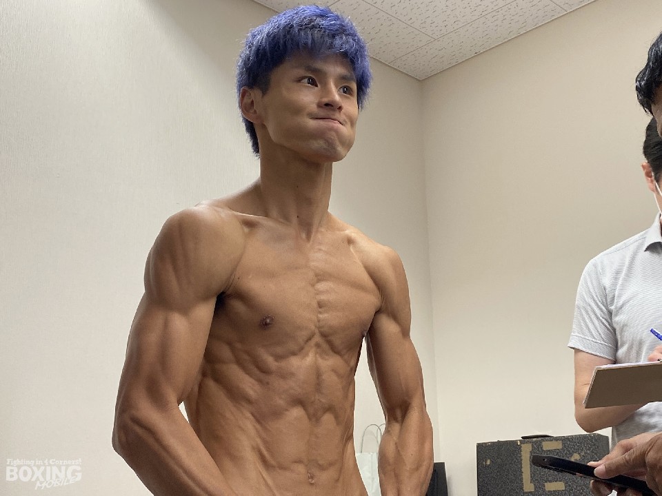 最初に計量した木村は、スーパーフェザー級リミットを100g下回る58.8kgでクリアした。「減量はいつもキツいが、今回は、最後までしっかりと動くことができた」と仕上がりの良さを強調。いつもより水分を多めに採って調整したという。