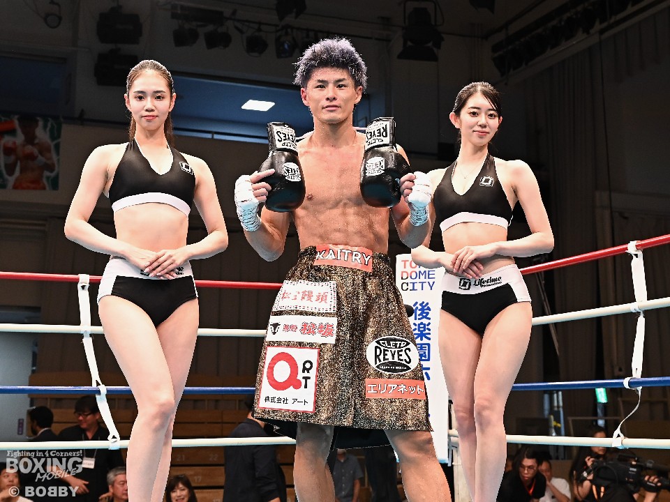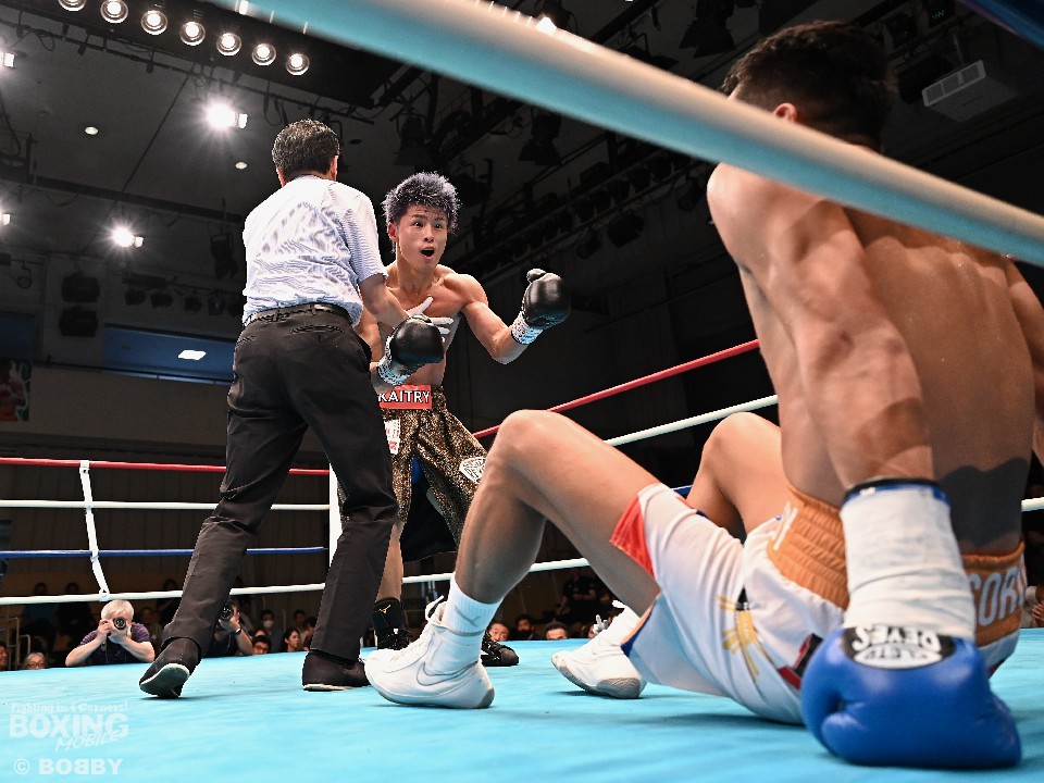 2回にテソロの左フック、右オーバーハンドを浴びて、ダウン寸前のピンチに陥った木村だが、ガードでダメージを最小限に抑えると、ボディにパンチを集めて挽回。5回、木村は左ボディでダウンを奪うと、再び左ボディでダウンを追加。立ち上がったテソロに襲いかかり、連打から右ボディストレートでキャンバスに沈めた。