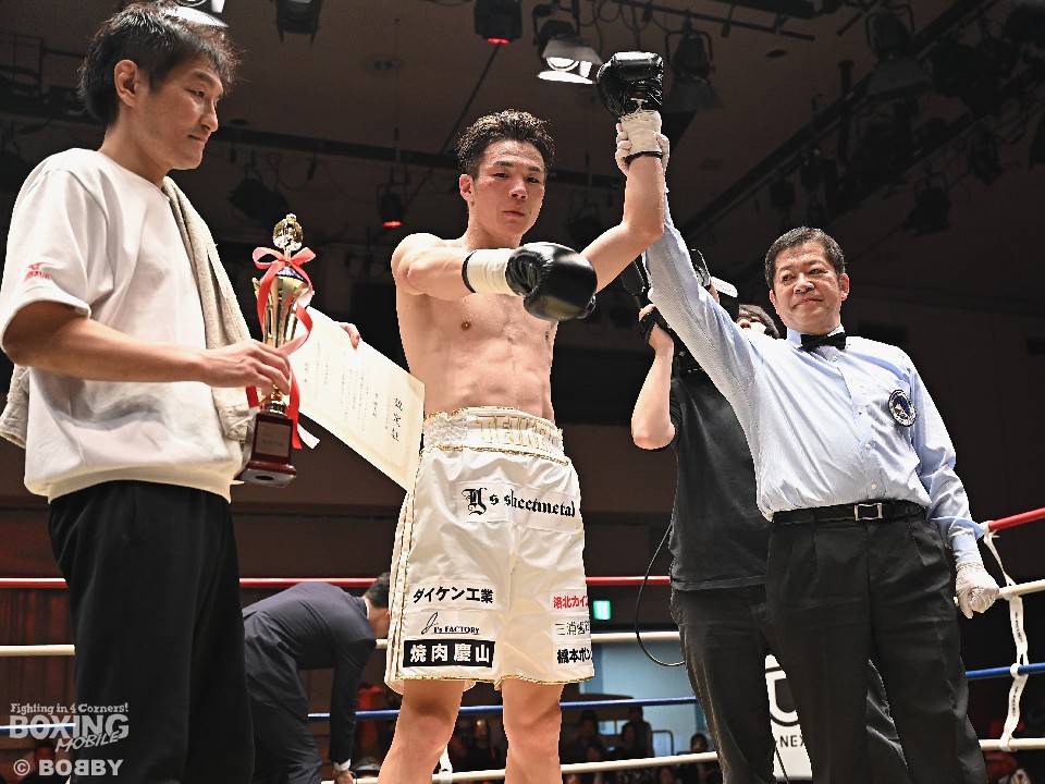 長身サウスポーの李に対してアオキは序盤、ガードを固めてジャブを凌いだ。試合が動いたのは3回、徐々に手の内を見せ始めた両者が、距離を詰めた。下から右ストレートを打ち上げるアオキに対して、李は上下の打ち分けでポイントを稼いだ。結果は判定決着。李が日本王者の藤田炎村(三迫)への挑戦権をつかんだ。