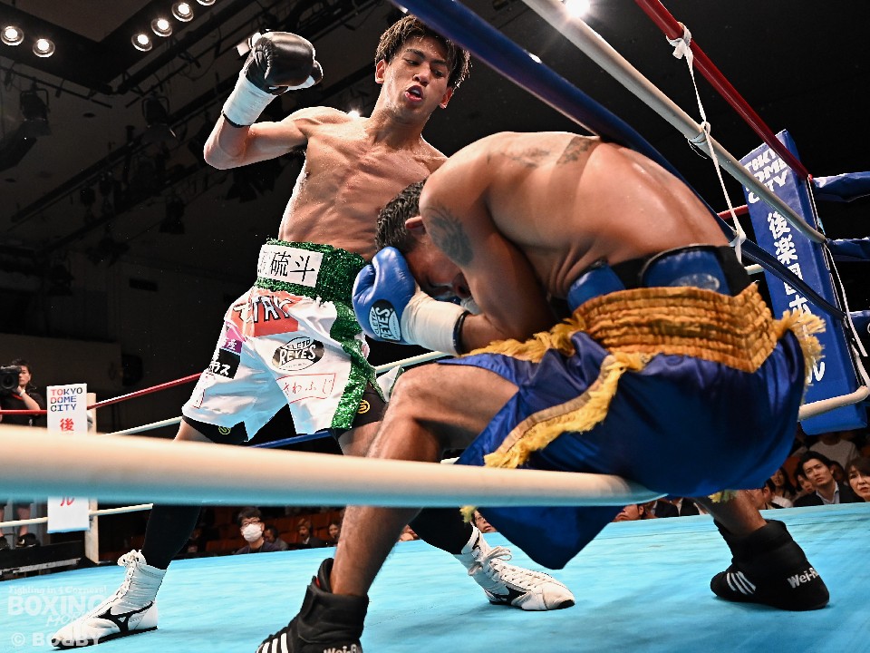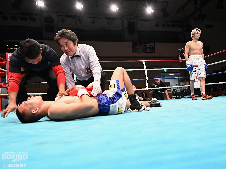 セミファイナルでは、日本スーパーバンタム級11位の大湾硫斗(25=志成)が、パイ・パーロップ(40=タイ)と56.0kg契約8回戦で激突。初回は慎重な試合運びを見せた大湾だが、2回になると強烈な右フック、左ボディでペースを掌握。4回、大湾は右ストレートで顔を弾くと、連打から左ボディでダウンをゲット。再開後、パンチをまとめてフィニッシュした。