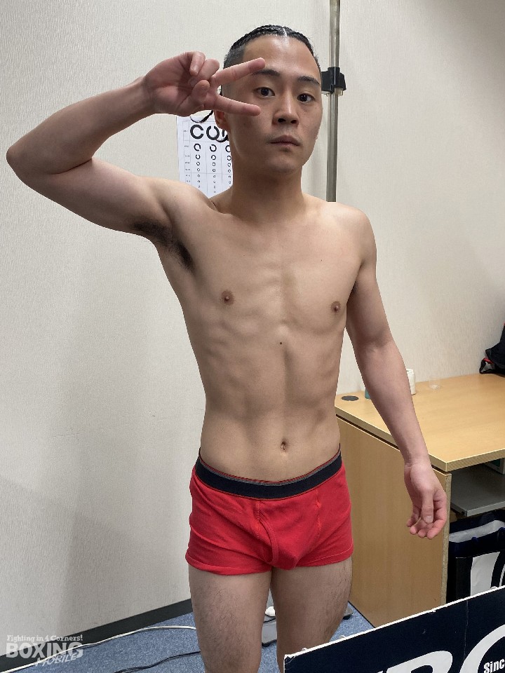 先に秤に乗った大久は、フェザー級リミットを300g下回る56.8kgでクリアした。計量後に取材に応じた大久は「自分が引っ張っていき、この興行をもっと盛り上げていきたい」とメインイベンターとしての自覚を示すと、「『大久だったら挑戦してもいいんじゃないか』という内容を見せる。3ラウンド以内に仕留めたい。今回は右ストレートで倒すところを見てほしい」と、ノックアウト勝ちを約束した。