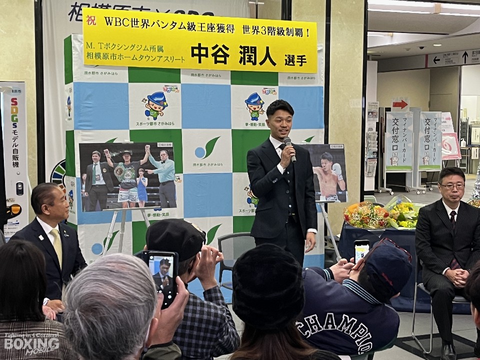 2月24日に行われた世界タイトルマッチで、WBC(世界ボクシング評議会)バンタム級新チャンピオンに輝いた中谷潤人(26=M・T)が8日、相模原市役所を訪れ、本村賢太郎市長に世界3階級制覇を達成したことを報告した。