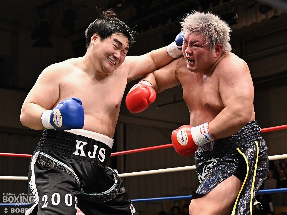 ヘビー級6回戦では、藤中大和(38=DANGAN)とキム・ジョンス(20=韓国)が激突。初回から左右フックを振り回し、重量級らしい打ち合いを見せる中、2回にキムが左ボディでペースを握ると、左フックから連打でダウンを演出。藤中に10カウントを聞かせた。