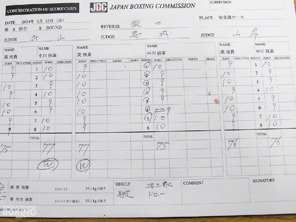 初回はサウスポー中川が右フックを好打し、好スタートを切ったが、2回以降は、英が距離を潰して右ストレートを決め、積極的な攻撃を展開。6回にはワンツーで棒立ちにさせて、攻勢をアピールした。しかし、中川は7回に右フックで英の膝を揺らすと、最終8回も左ストレートから連打で盛り返した。試合終了のゴングが鳴ると、二人に対して盛大な拍手が送られた。採点は三者三様の引き分けで、決着はつかなかった。