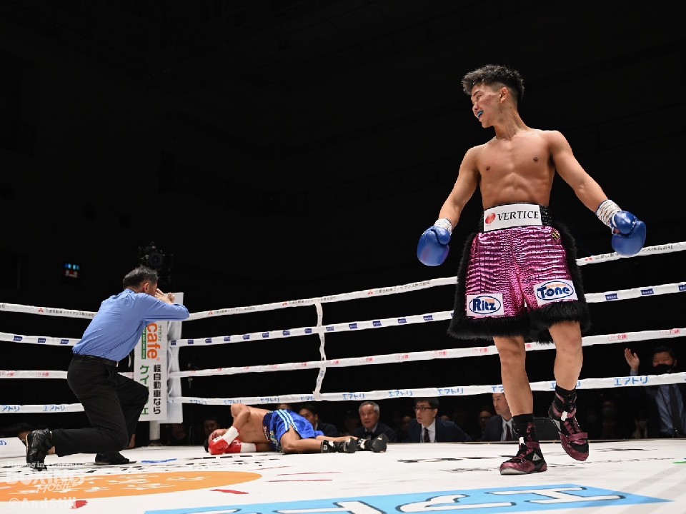 左アッパーで仕留めた森脇流星(19=KWORLD3)は試合後、「サウスポーが相手だったんでやりにくかった。ボクシングを1から見直して、トレーナーとやってるので、もっと強くなります」と勝利を報告。憧れのプロの舞台に立てたこと、家族や仲間が応援に駆けつけてくれたことに感謝の気持ちを伝えた。「バンタム級は余裕があったので、次はスーパーフライ級」で試合をすることを伝えた。