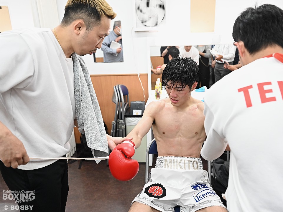 試合後の囲み取材に同席した粟生隆寛トレーナーは、「最後の瞬間だけ、『斬る』インパクトだけちゃんと打て、というアドバイスをした。ちょっと硬さはあったが、今後は体力的なスタミナはもちろん、精神的なスタミナも向上させたい」と笑顔で労った。