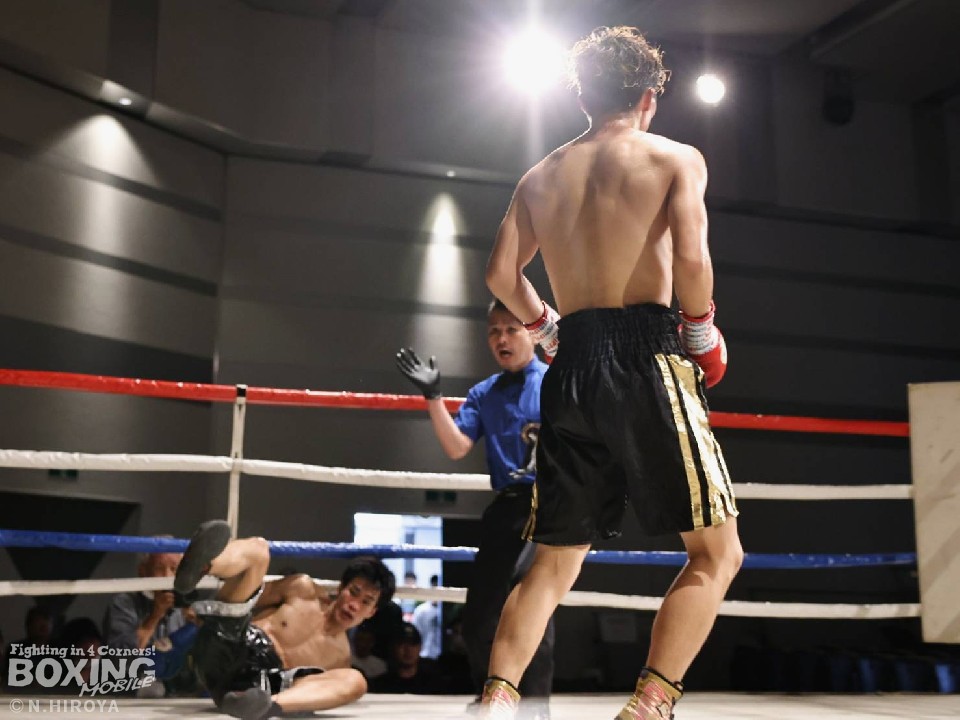五十嵐のジャブに苦労した竹中だが、積極的な攻撃でペースを掌握。4回に右ストレートでダウンを奪うと、ロープに詰めて連打で、レフェリーストップに持ち込んだ。