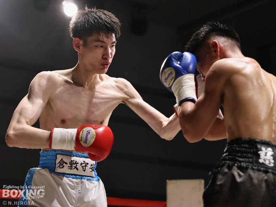 第4試合、ライトフライ級4回戦では、見尾涼馬(21=倉敷守安)と嶋田来生輝(21=JM加古川拳)が激突。まずは長身サウスポーの見尾が、右フックを合わせてダウンを先制。2回以降は、嶋田が距離を潰して挽回。その後は激しい打撃戦で、この日一番の盛り上がりを見せた。ジャッジ3者とも1ポイント差で、見尾に軍配が上がった。