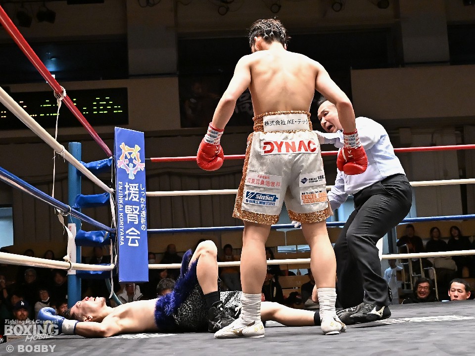スーパーフェザー級決勝4回戦では、高橋泰征(24=本多)とやっちまったなぁ海斗(21=UNITED)が対戦。サウスポー高橋が左ボディストレートを差し込み先手を奪うと、2回に左ストレートで効かせて連打で攻勢。左ストレートで痛烈に倒して、フィニッシュした。