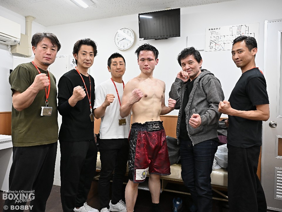 FUNABASHI E-BOX GYMの遠藤一充会長(写真左から3番目)は、「初回を踏ん張れたので、『ここからはお前の時間だぞ』と言って送り出した。保木井らしい気持ちを出したボクシングだった」と褒めたたえた。