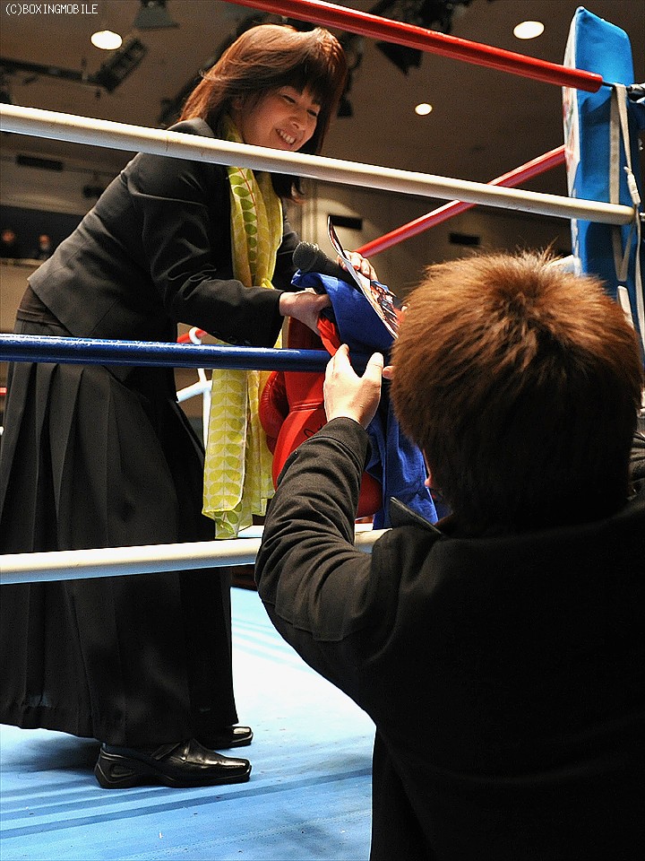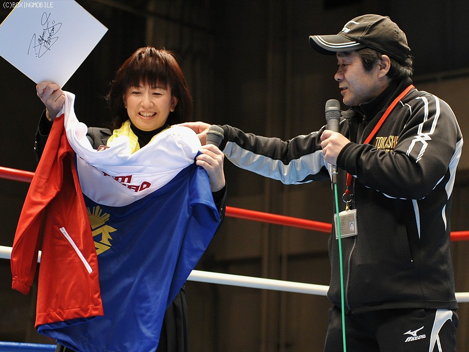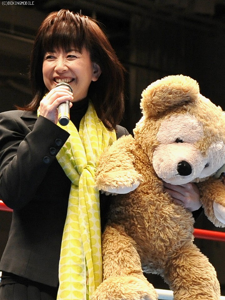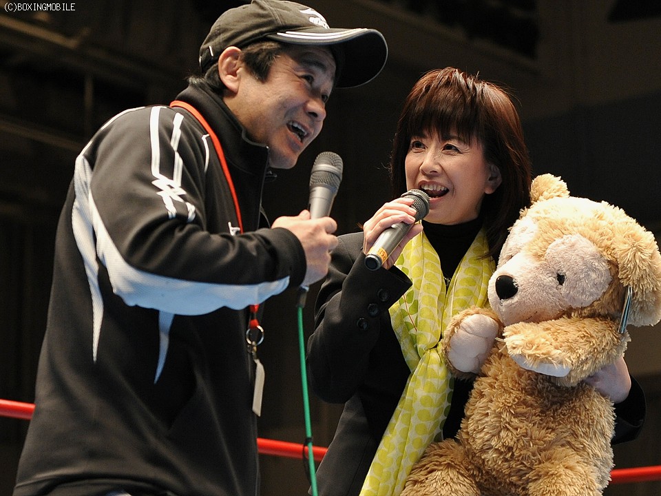 渡嘉敷会長に呼ばれリングに上がったのは、70年代後半のテレビ番組「コメットさん(2代目)」で一躍トップアイドルとなった大場久美子さん!芸能活動開始から36年が経つが、笑顔は今も当時のままで、40代以上のおやじボクシングファンから熱い声援が送られていた。