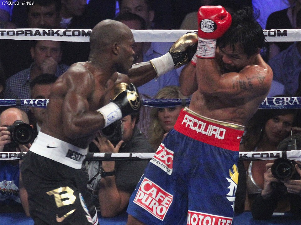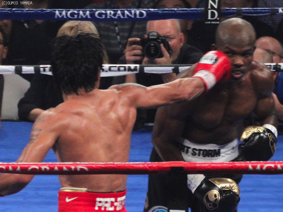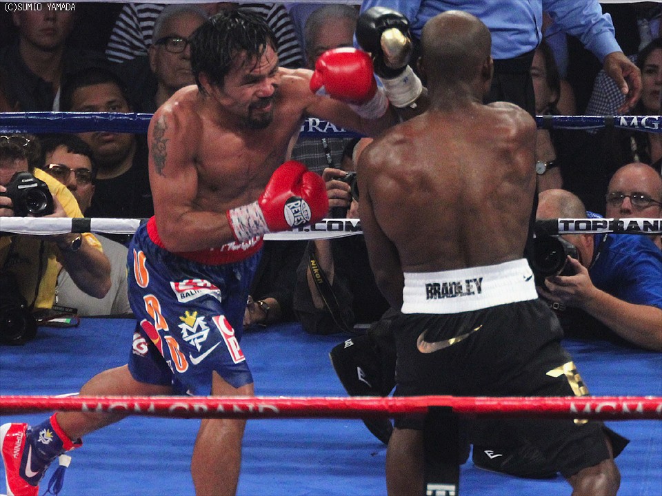 前半からペースを握ったパッキャオだが、いつも以上にミスも目立ち、左ストレートはヒットしても浅いという状態が続いた。パッキャオは4回にはラッシュをかけ、左右の連打を繰り出して明白なポイントをゲット。逆にブラッドリーはダメージのためか動きが鈍くなった。
