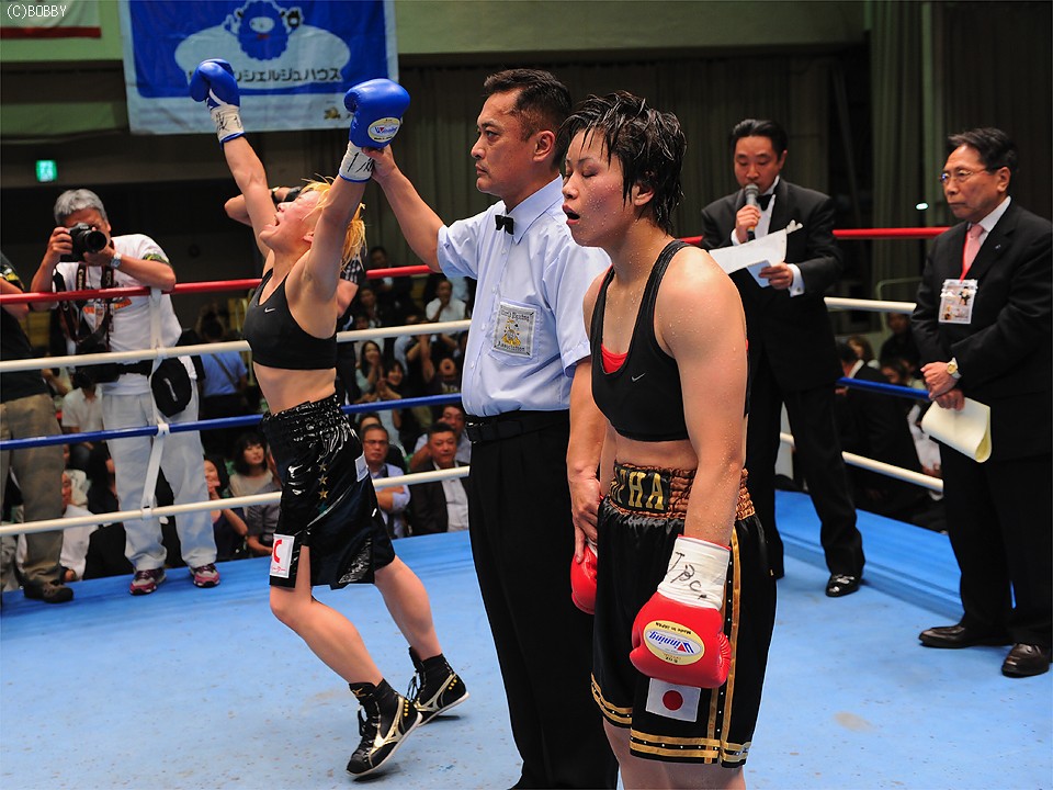 女子のレベルの高さを存分に見せた試合は、ツナミの速さと技術を山口の力と回転力が上回り、最大4ポイント差をつける判定3-0で王座交代。山口が2度目の世界挑戦で新王者に輝いた!