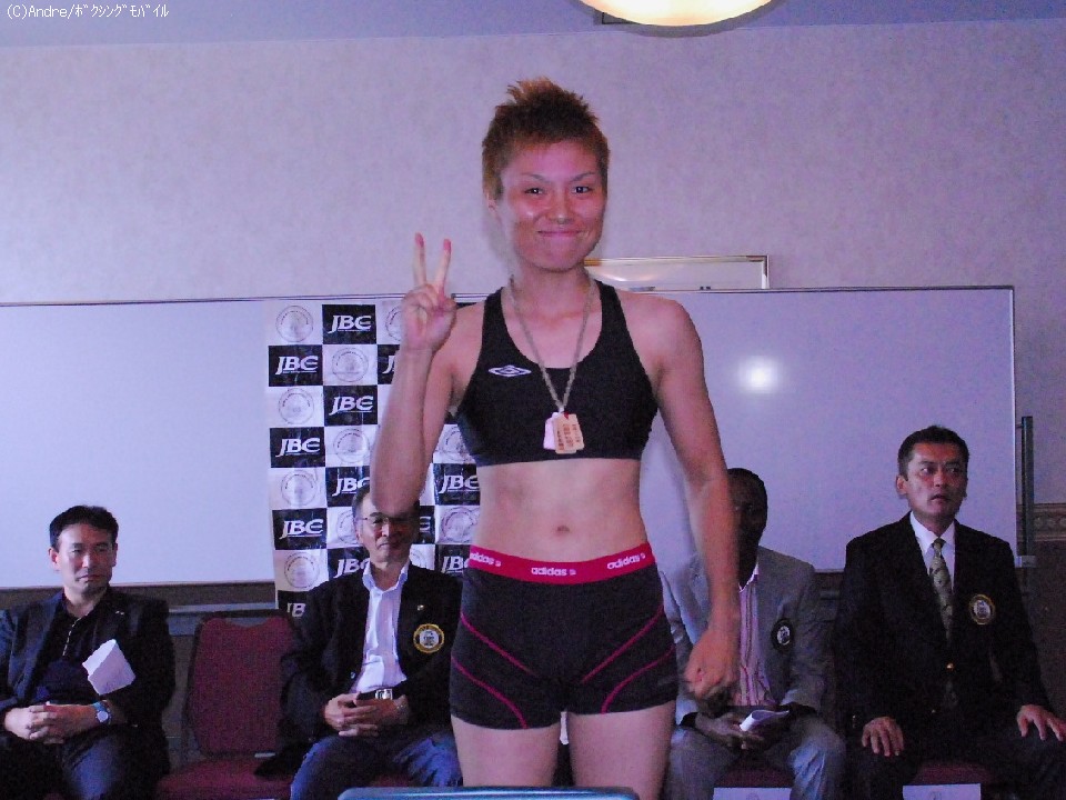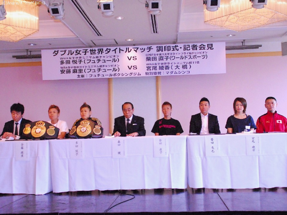 16日に行われるWBA女子世界ライトミニマム級タイトルマッチの前日計量と調印式が15日、大阪市内のホテルで行われた。王者・安藤麻里(フュチュール)は、同門でミニマム級王者の多田悦子と笑顔で会場入りした。