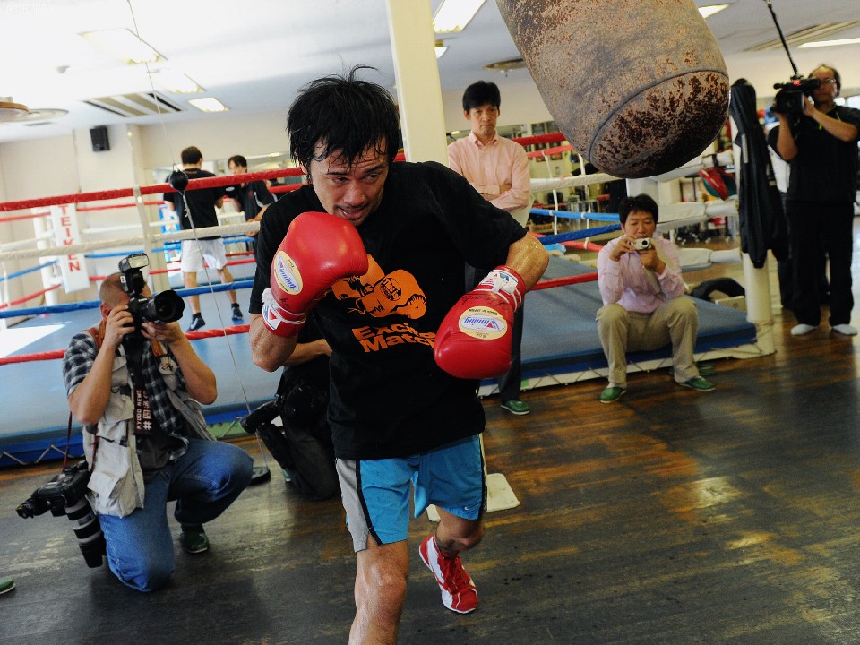 29日、WBC世界バンタム級王者・山中慎介は会見終了後、集まった報道陣に向けて公開練習を行った。