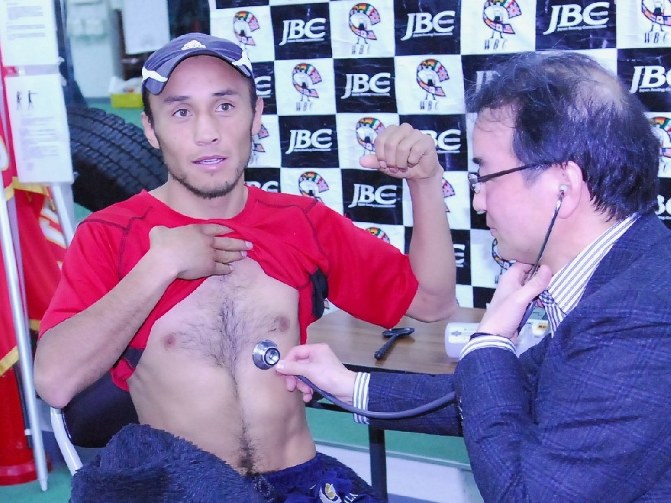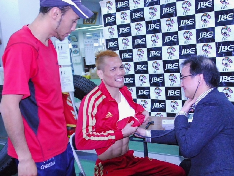 2日後に迫ったWBC世界バンタム級王者挑戦権を懸けて戦うマルコム・ツニャカオ(真正)とクリスチャン・エスキベル(メキシコ)は22日、ツニャカオの所属する神戸市内にある真正ジムにて予備検診を行い、両者笑顔の初対面となった。