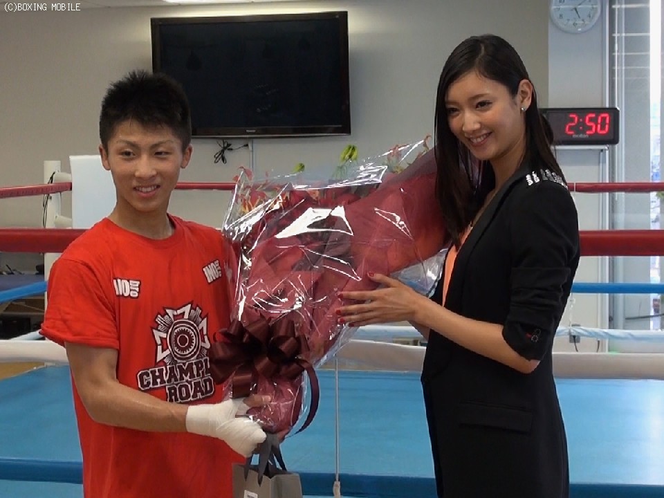 シャドー・ミット打ちで汗を流した井上尚弥は、サプライズゲストとして登場したモデルの菜々緒さんから、花束とネクタイをプレゼントされると思わずニッコリ。20歳になった井上は、「より責任感をもって行動したい」と話すと「20歳になって最初に迎える16日の試合は、頭を使って、駆け引きをして、今まで以上に大人の試合をしたいです」と意気込みを語った。