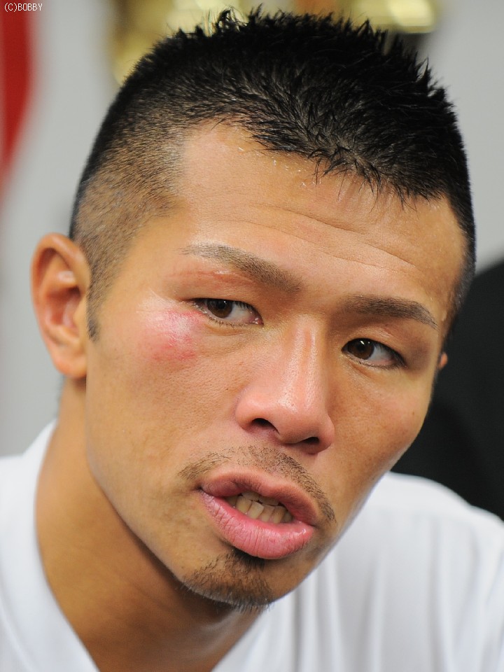 相手のジャブでスったという左目下の擦り傷、相手の頭に当たったと右拳を冷水に冷やしながらの会見となった内山は、「1〜3R、相手のノーモーションのジャブが結構入ってしまった。全然効いていなかったがイメージが悪いので、4Rから左右フック、ジャブを出したら相手が足を使い始めたので、嫌がっているなと…」と試合を振り返った。試合を決めた5Rについて、「左ボディは、狙っていたわけではなく、流れの中でうまく決まった。ボディに拳がめり込んで入った感触がした」話した。