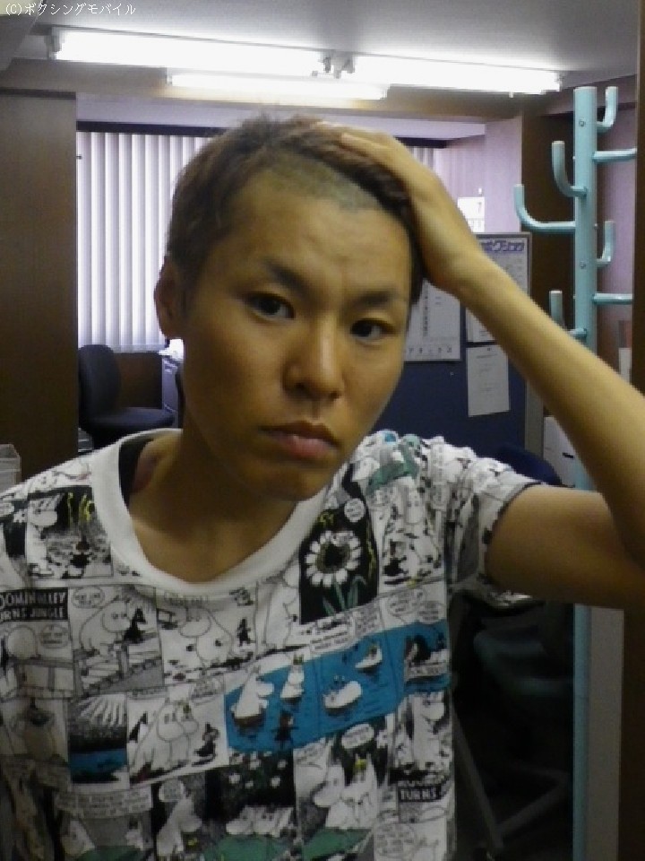 会見の途中「ちょっと見て新しい髪型やねん」と前髪をあげると「いつも試合前に切ってくれる美容師さんに派手なことはせんといてって頼んだらこんなんなってん」と頭の前部を刈り上げた新髪型を集まった報道陣に披露した。