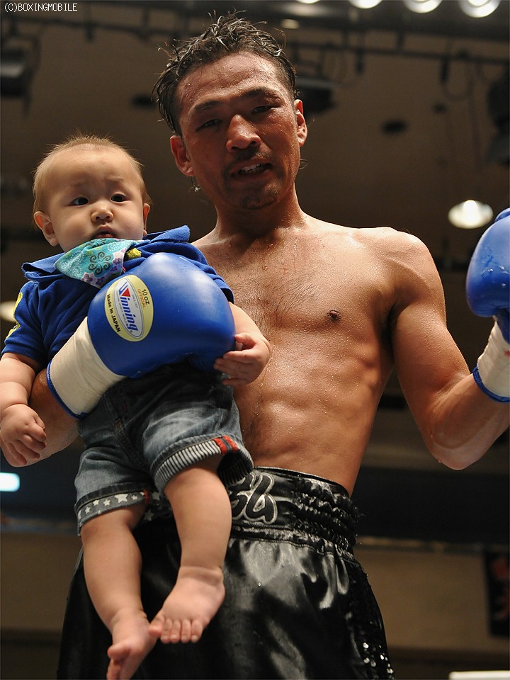 試合後のリング上では、8ヶ月になる長男の泰駕くんを抱き、約100人からなる応援団の祝福を受けていた。