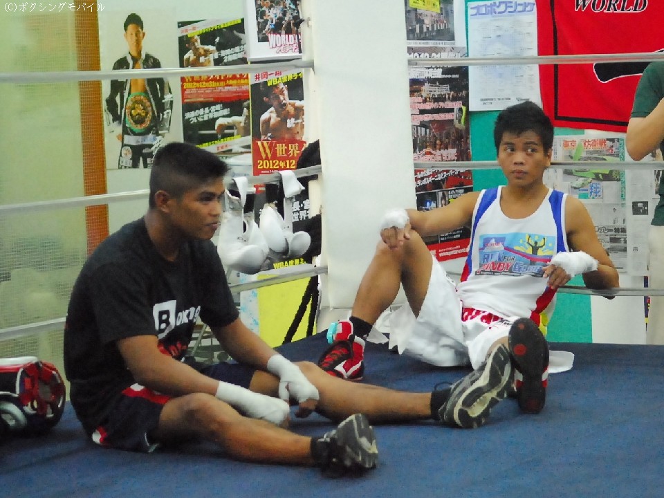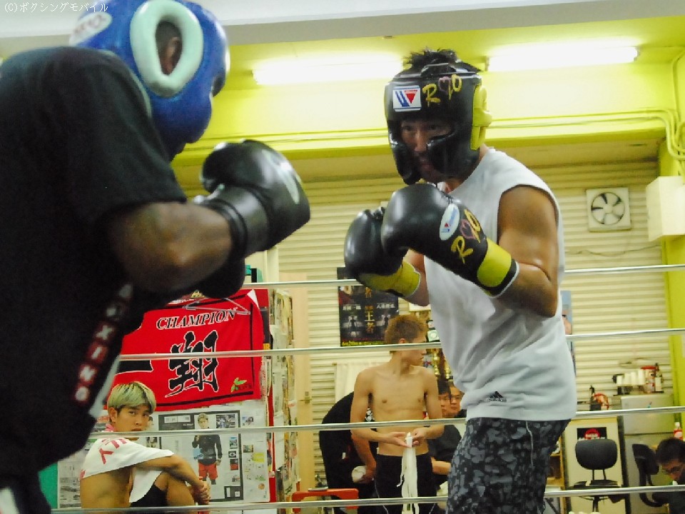 31日にメキシコで世界挑戦する角谷淳志(金沢)と5R、昨日来日したフィリピン人の練習パートナーと3R、計8Rのスパーリングで一翔が汗を流すと、宮崎も昨日来日したフィリピン人のパートナーを相手に6Rのスパーリングを公開した。