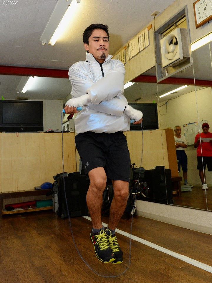 勝又ジムに到着したロドリゴ・ゲレーロは記者達に「オハヨウゴザイマス」と笑顔で挨拶をすると、バンデージを巻きシャドー、ロープでウォーミングアップを始めた。