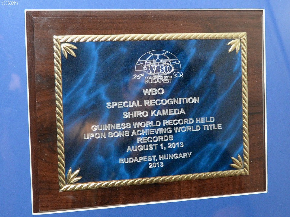 現在は剥奪されている国内プロモーターライセンスの復活を願う亀田史郎氏が、WBOよりプロモーターとして表彰され記念の盾を受賞したという。