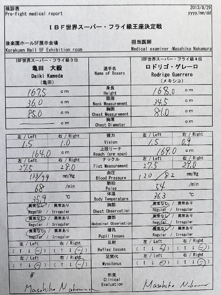 9月3日に香川県高松市のサンメッセ香川で行われるIBF世界スーパーフライ級王座決定戦で亀田大毅(24=亀田)と拳を交えるロドリゴ・ゲレーロ(25=メキシコ)が29日、都内の後楽園ホール展示場で予備検診に臨んだ。減量苦の大毅とは対照的に報道陣に笑顔を振りまいたゲレーロは「打ち合って会場を湧かせたい」と意気込みを語った。