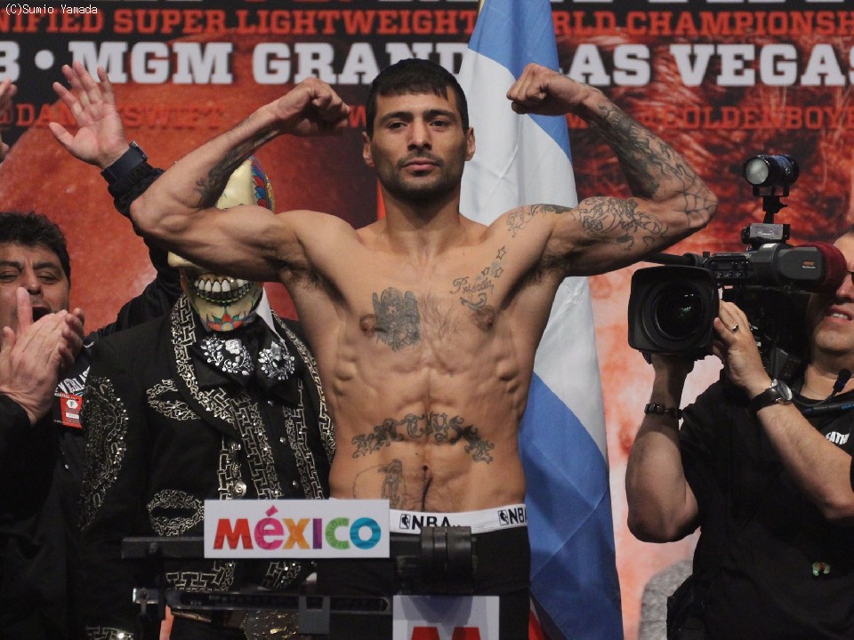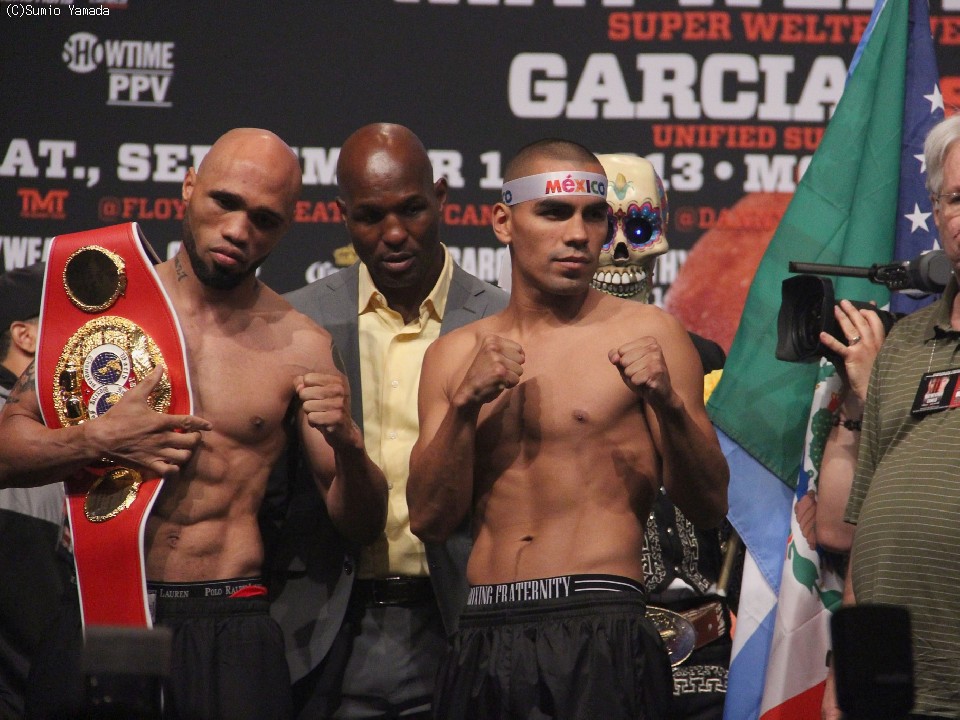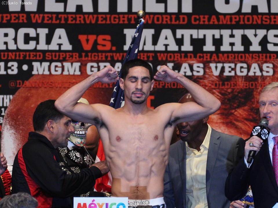 9月14日(日本時間15日)米国ネバダ州ラスベガスのMGMグランドガーデン・アリーナで行われる、5階級制覇王者フロイド・メイウェザー(米)対WBA・WBC世界スーパーウェルター級統一王者サウル"カネロ"アルバレス(メキシコ)。現地関係者からは"スーパーアンダーカード"と言われ、注目されるメイン級の前座、WBA・WBC世界スーパーライト級王者ダニー・ガルシア(米)対WBC同級暫定王者ルーカス・マティセ(亜)による王座統一戦の前日計量が過去最大規模でファンにも公開された。