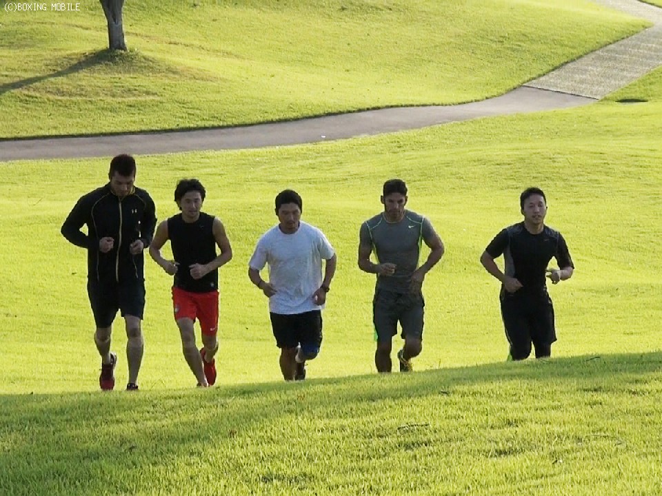 会見後、コースでのランニングをスタートした5選手だったが、村田選手が圧倒的な速さで3周を走り終わり、全員が戻った後に3ラウンドのシャドーを行いストレッチをしてその日の練習は終了した。