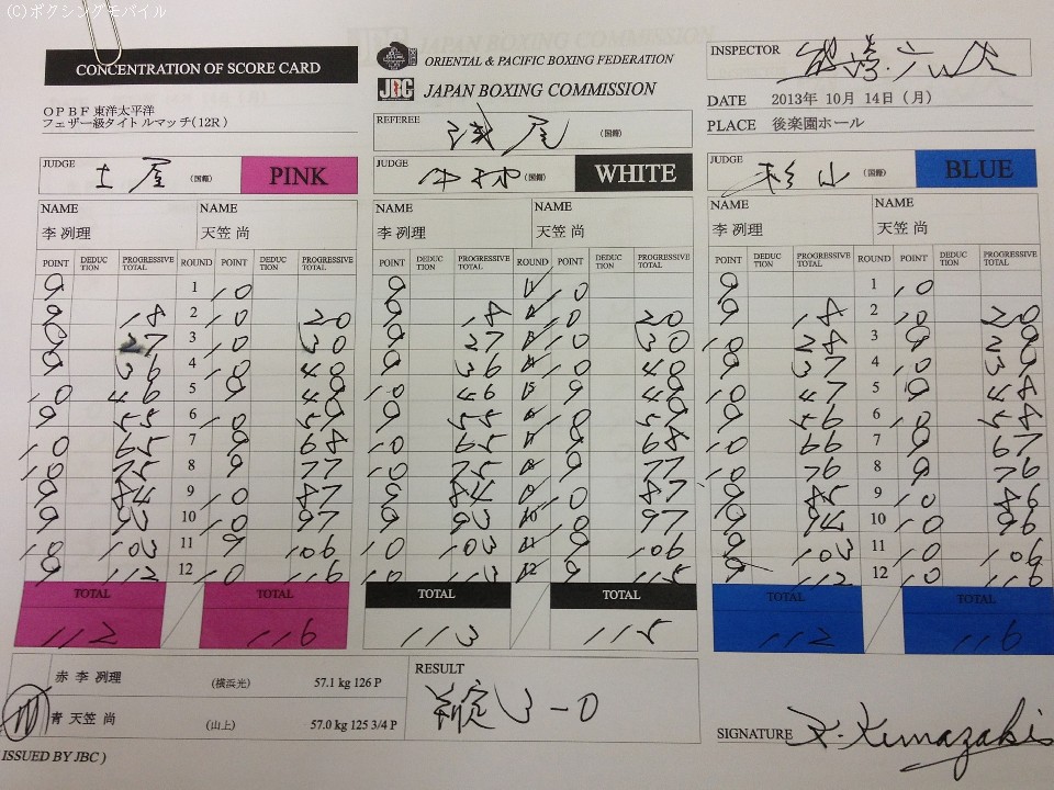 8Rの途中採点は李が追い上げるも、天笠のリードは変わらず。終盤、懸念されたスタミナは衰えず、元世界王者の地力を見せる李だが、天笠は体を入れ替えての早い返しで追撃を許さず。フルラウンドまで進んだ一進一退の試合は、天笠が最大4ポイント差の判定3-0で李を破り、東洋太平洋と日本の2冠王者となった。