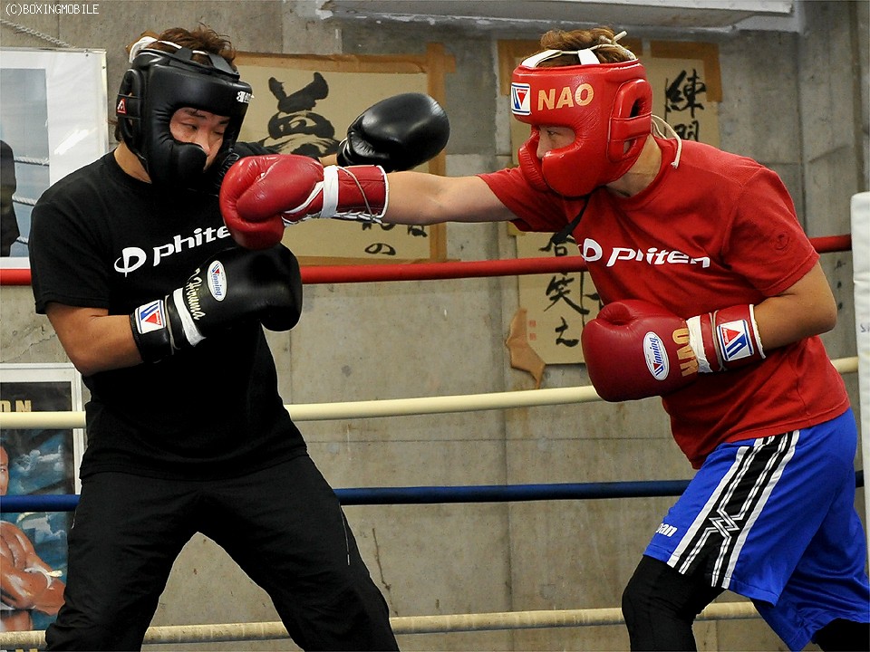 ミット打ちを予定していた公開練習だが、具志堅用高会長の鶴の一声で、急遽2分2ラウンドのスパーリングに変更。柴田マネージャーが相手を務め、"仮想山口"で果敢に攻め込んだが、ほぼナチュラルウェイトで試合に臨める藤岡は、速い踏み込みを意識し、キレのある動きから遠慮なく柴田マネにパンチを繰り出していた。