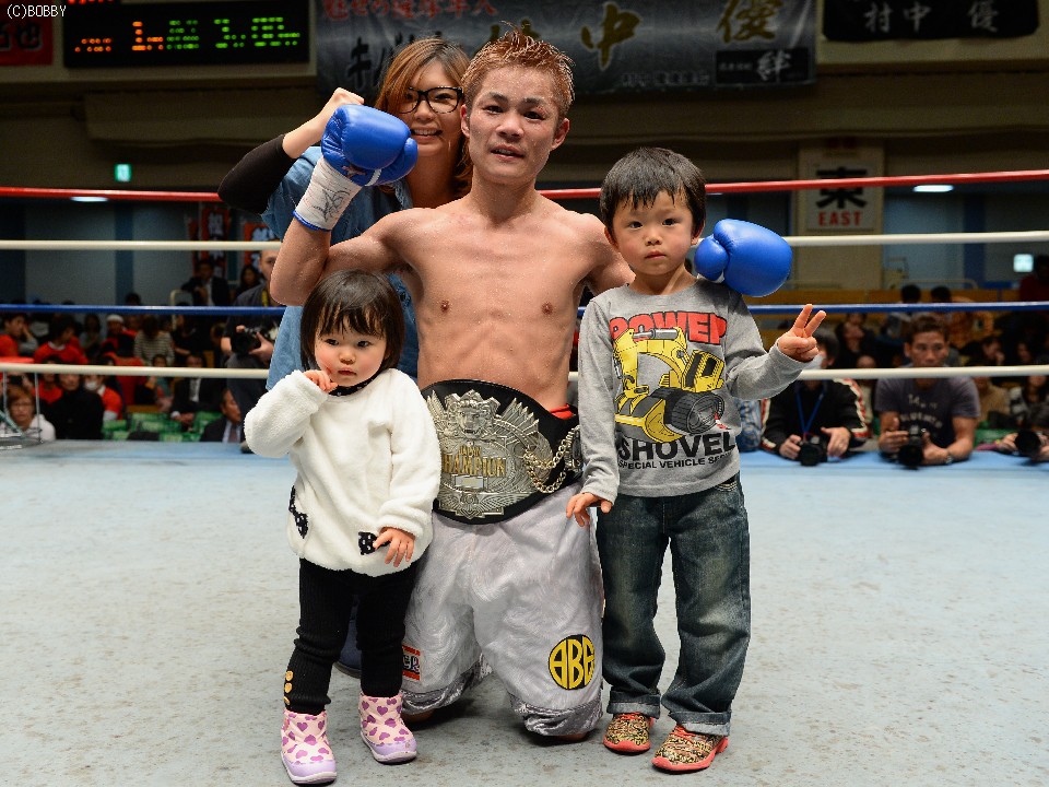 一方、一発で王座獲りをはたした村中は、「負けたと思った。信じられない、運が良かった」とベルトを見つめ喜び、この日一番の応援に感謝した。粉川については「もっとパンチが当たると思っていたが、距離がやりにくかった。先手、先手で行くつもりがさせてもらえなかった。粉川選手は強かった、今日の勝利はギリギリです」と称えた。
