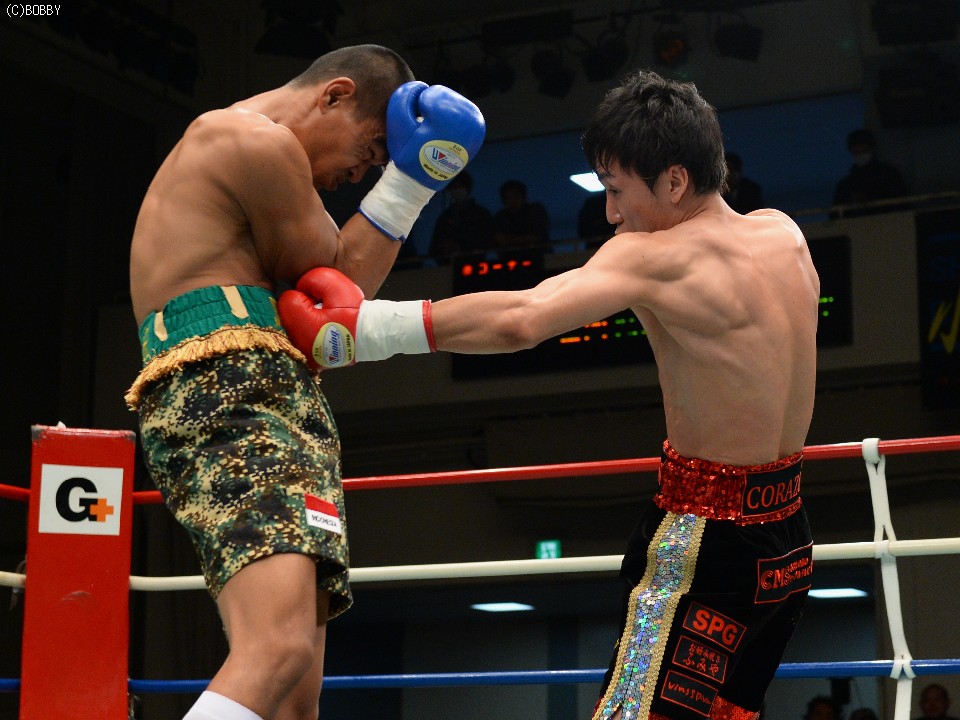 「毎試合がタイトルへ向けてのアピール」と話す石本はこの日、インドネシア・スーパーバンタム級6位のズン・リンダム(26=15戦11勝5KO3敗1分)とスーパーバンタム級(122ポンド)より重い124ポンド契約で対戦。1R、体前面をガードで覆うベタ足のリンダムに対し、石本は横っ腹を叩き、上にはワンツー、フックと早くも攻勢に出る。石本の左ボディで体を曲げたリンダムは効いてないと虚勢を張るも、顔は明らかに苦痛に歪み、右フック、アッパーでロープに詰められると最後はワンツー、フックの連打を浴びダウン。10カウントが数えられた。