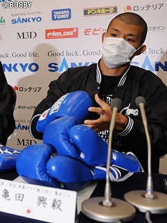 終始険しい表情で会見に挑み、一言一言噛み締める様に発言していた内藤に対し挑戦者・亀田興毅は「ここまで出来る事は全部やって来た。あとは俺自身が最高の結果を出すだけ。自分のボクシングをする!!」と悔いの無い練習が出来きたとコメント。意気込みについて興毅は「最後は気持ちの勝負。闘志を出して戦う。(内藤に対し)良い戦いをしましょう。世界タイトルマッチに相応しい試合を。悔いの残らない試合をしましょう。そして俺がシッカリ勝って2階級制覇をします!!」と王者・内藤にメッセージを送るも必勝宣言。最後にファンに向け「決戦まであと2日。俺がリングで戦う姿を観て貰いたい」と静かな表情で語った。