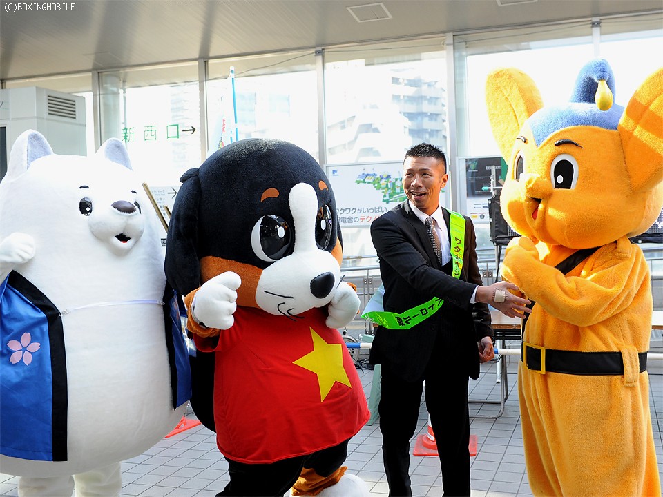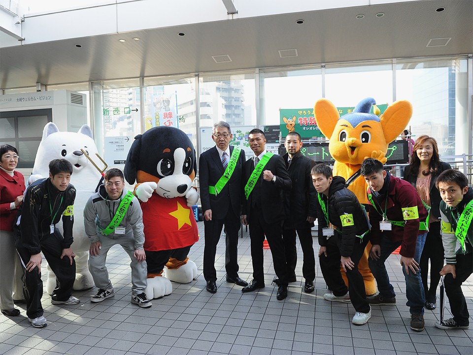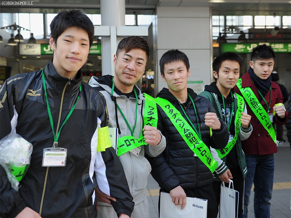 ノックアウト・ダイナマイト、WBA世界スーパーフェザー級王者の内山高志(34=ワタナベ)が、オレオレ詐欺(旧名称)撲滅に一役買った。22日、東京・JR大崎駅周辺で品川区、大崎警察署、大崎防犯協会ら50人近くで実施された「お母さん助けて詐欺ノックアウトキャンペーン」に内山率いるワタナベジムの選手、トレーナーが参加。一行は大崎駅周辺の約500mを練り歩き、西口前で啓発チラシを配布した。