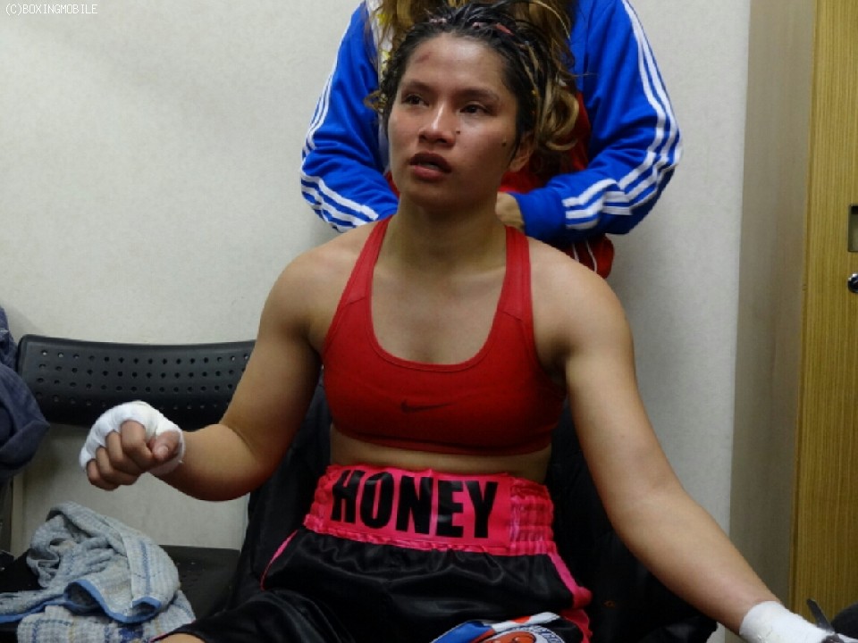 日本での初黒星を喫したハニーは、控え室に戻り試合を振り返った。「ツナミにスピードはあったが、効かされたパンチはあまりなかった。それでもパンチを空振りさせられスタミナが切れてしまった」と力の差を痛感。肩を落としたが、それでも「良い経験ができた。力をつけてもう一度タイトルに挑戦したい」とリベンジを誓った。