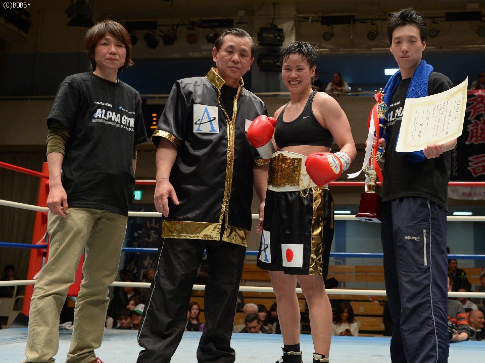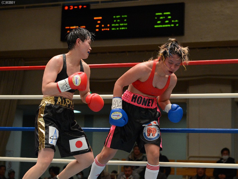 ハニーも引かずに打ち返す気の強さを見せたが、回転力に差がありロープを背負う場面が続くと、最後は7Rに連打を浴び、手が出なくなったところでストップ。天海が一昨年7月の世界王座陥落後、1年7ヶ月ぶりにベルトを巻いた。