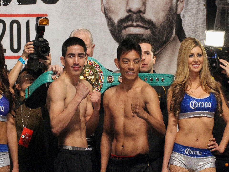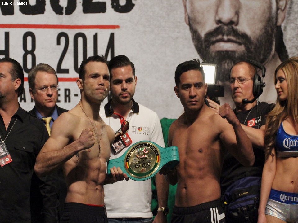 セミファイナルのWBC世界スーパーバンタム級タイトルマッチに出場するレオ・サンタ・クルス(メキシコ/米)と、挑戦者クリスチャン・ミハレス(メキシコ)はリミットちょうどの122ポンド(約55.3キロ)だった。