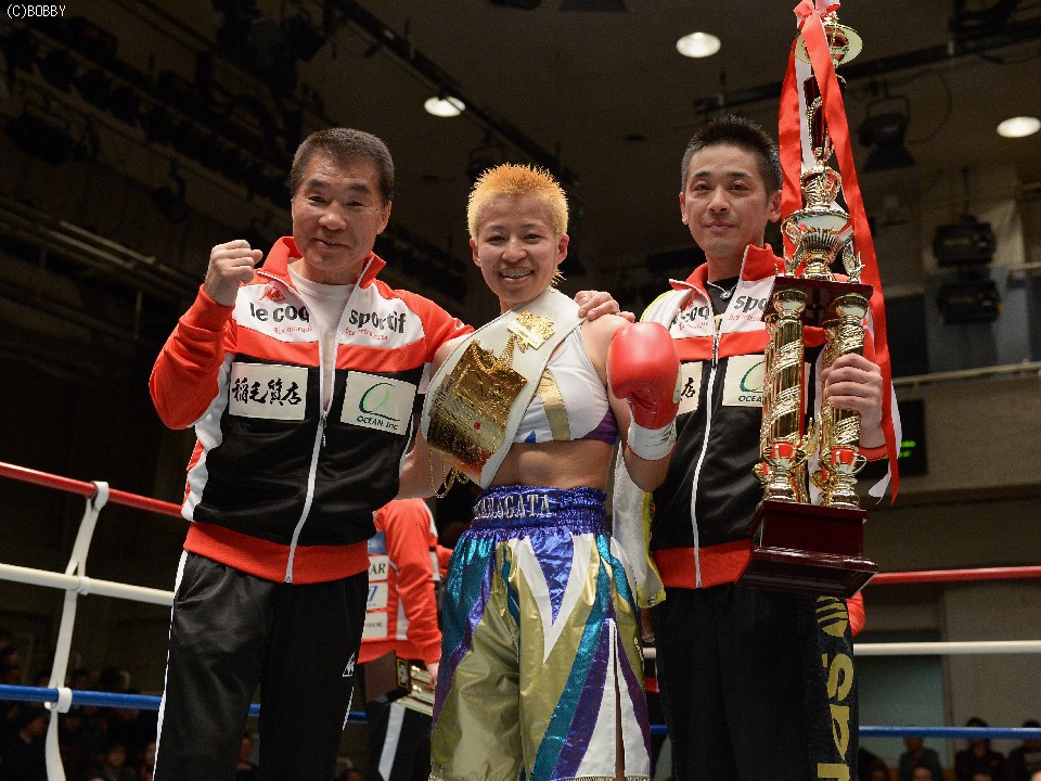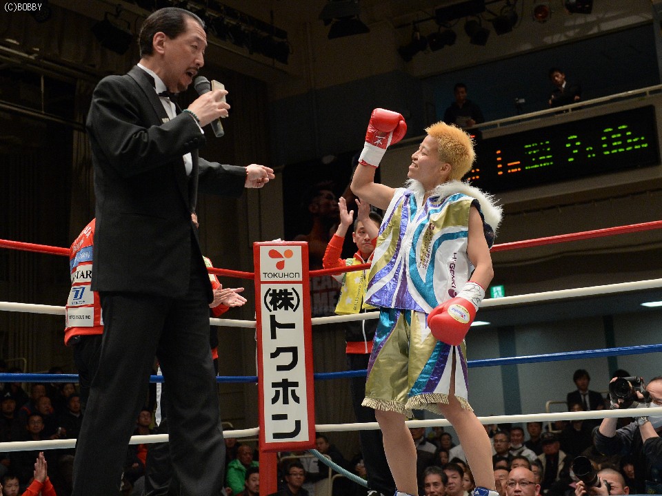 花形にとっては昨年12月に黒木優子(YuKO)と同王座決定戦を争いながら、ドロー判定で手にできなかったベルト。試合前には「忘れ物」を取りに来たと意気込み、1Rを過ぎると徐々にエンジンの回転数を上げ、手数で上回った。