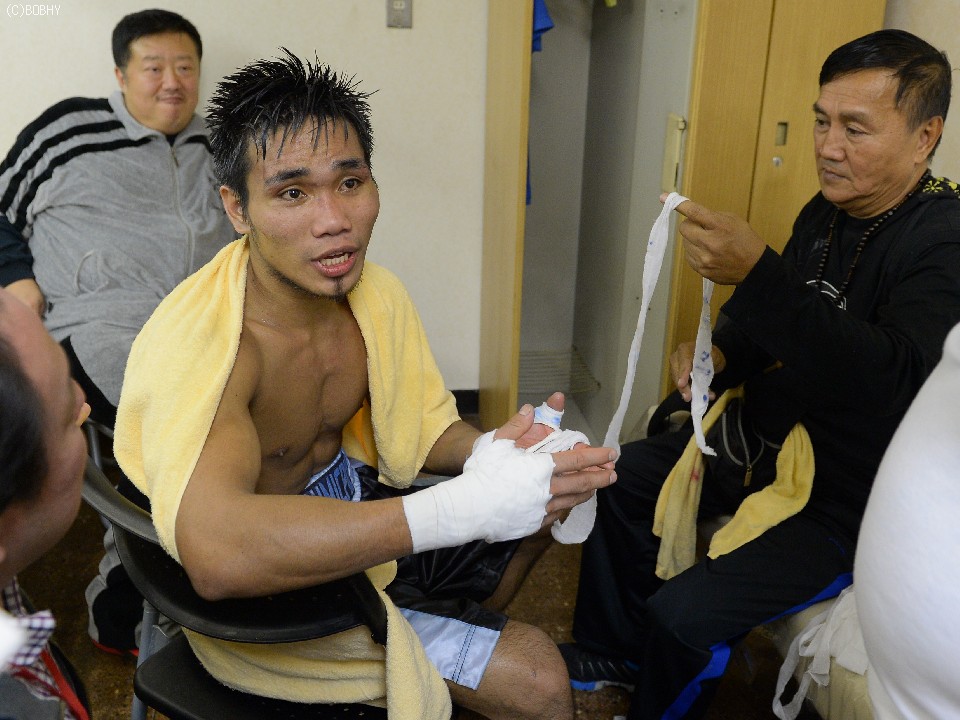一方、敗れた挑戦者。思ったような結果は出なかったが、自分のパフォーマンスには満足しているのか、控え室では終始笑顔だった。岩佐については「スピードもパンチもない」と切り捨て、「もちろん効いたパンチもなかった」と加えた。さらに試合地がフィリピンなら自分の勝ちだととも。「自分では勝ったと思ったが、クリンチに攻撃を寸断されてしまった」と、そのときは少し悔しそうな表情をみせた。岩佐の今後に話を振ると「世界を取るかどうかは分からないよ」と答を濁した。