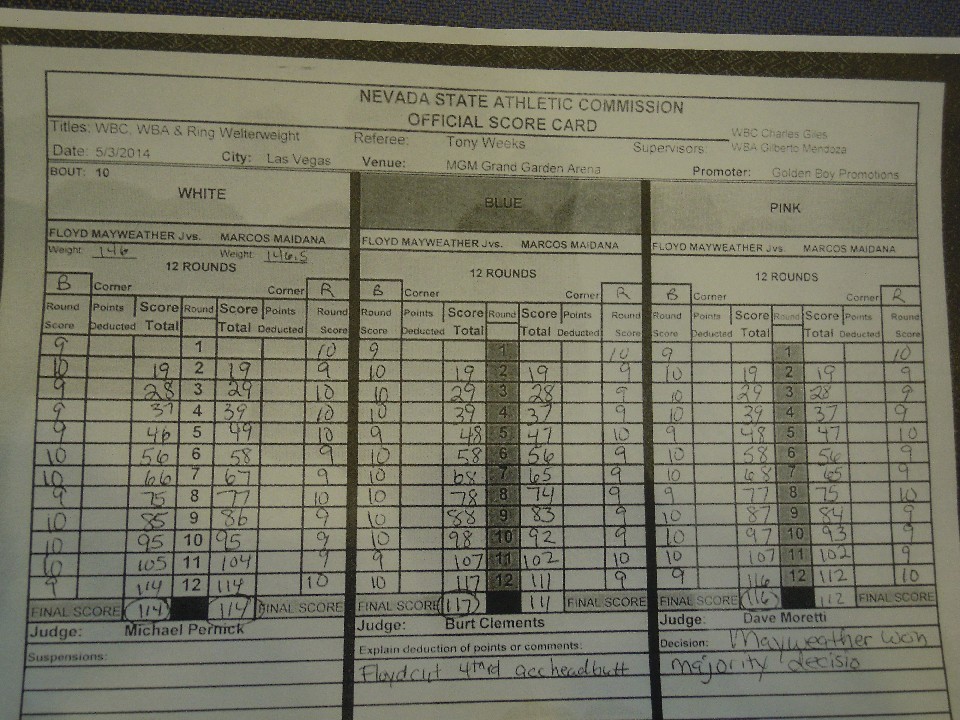 採点はひとりが114対114のイーブンだったが、残る二者は117対111、116対112でメイウェザーを支持していた。96年のプロデビューからの連勝を46(26KO)に伸ばしたメイウェザーは、WBCに加えWBA王座も手に入れた。リング上でマイクを向けられた統一王者は「厳しい試合だった。エキサイティングな試合を見せられたと思う。マイダナはタフで勇敢だった。リマッチ? みんなが見たいならやるよ」とコメント。善戦しながら敗れたマイダナは「もちろん自分が勝ったと思った。メイウェザーはもっと男らしく勇敢に戦うべきだったと思う。彼が主導権を握ったラウンドもあったが、ほとんどは私が掌握していたはず。でも仕留めることはできなかった。リマッチ? 私が勝っていたのだから、やらせてやってもいいよ」と、まるで勝者のようだった。39戦35勝(31KO)4敗。