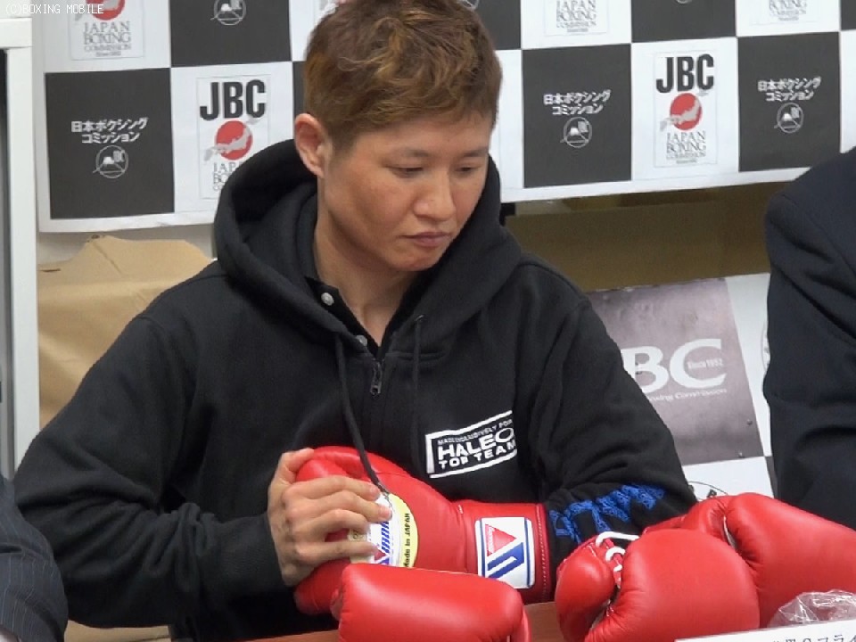 調印、グローブチェックを終えた、王者・藤岡は「難しいと言われている初防衛ですが、いつも通りの動きでいきたいと思います。3階級上げたため、体格面を気にする質問をよくされるが、今回の試合でそれを証明したいです」とコメント。