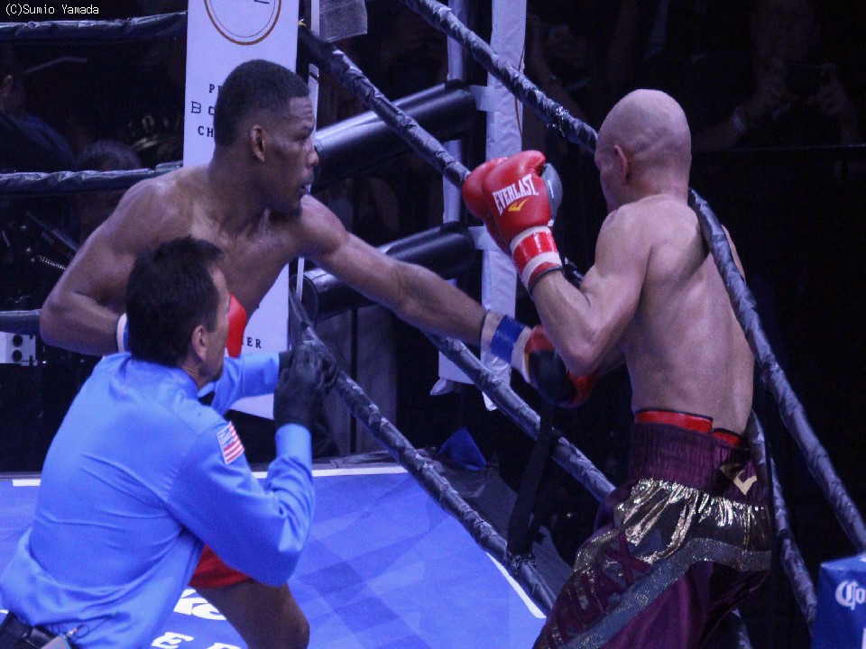 ミドル級はジェイコブスが主導権を握っていたものの仕留めることができないまま勝負は最終回に突入。ここでジェイコブスは左右をヒットして挑戦者を腰砕けにさせ、ロープにもたれかかったところで8カウントが入った。再開後、ジェイコブスはすぐに左右を連打、レフェリー・ストップに持ち込んだ。初防衛に成功したジェイコブスは30戦29勝(26KO)1敗。トラックスは29戦25勝(12KO)2敗2分。