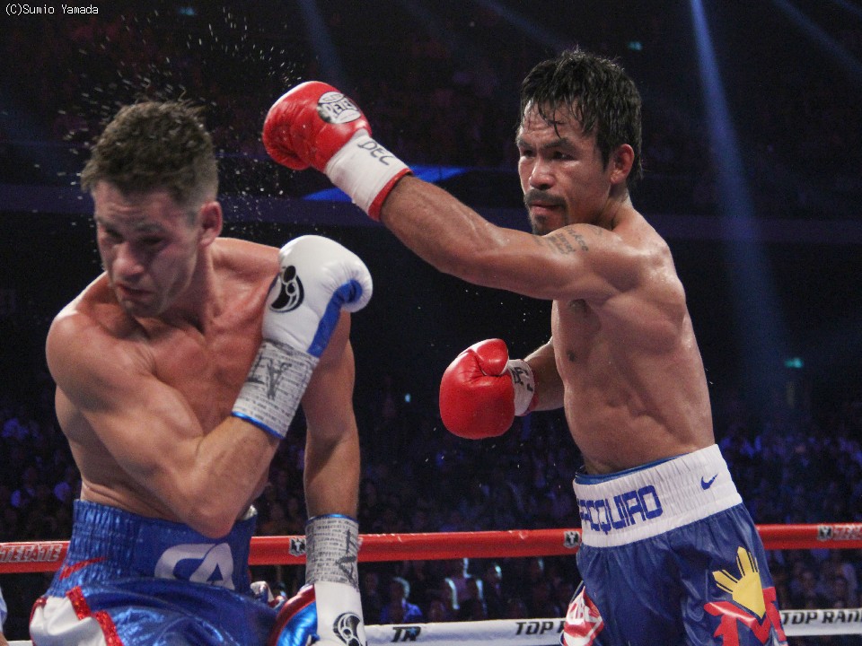 今回の試合に備えパッキャオは3月初旬からロサンゼルスのワイルドカードジムでトレーニングを積んできた。ラスベガスまでは約400キロ、車だと5時間前後かかる。なお、試合前日の5月1日にはMGMグランドガーデン・アリーナで計量が行われるが、一般客にも10ドル(約1200円)で公開されることになっている。このチケットにも200ドル(約2万4000円)から700ドル(約8万4000円)のプレミアがついているというから驚きだ。