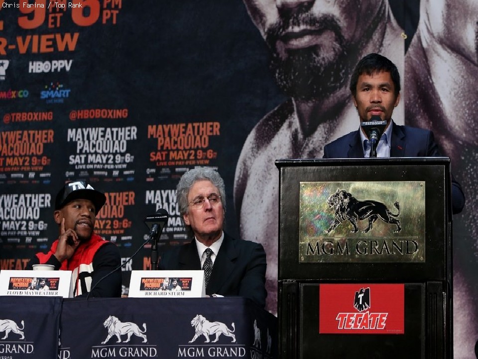 ボブ・アラム・プロモーターやテレビ関係者、WBCのマウリシオ・スライマン会長らの挨拶後、まずはスーツ姿のパッキャオがマイクの前に立った。「フロイド(メイウェザー)と私はこの試合のために厳しいトレーニングを重ねてきた。土曜日にはすばらしい試合を披露するつもりだ。因縁ではなく、これが私たちの仕事。歴史に名前を残すため、私たちは最善を尽くす。試合後、再びフロイドと対話できることを願っている」と、パッキャオは英語で話した。続いてスウェット姿のメイウェザーがマイクの前に立ち、「いよいよ戦いのときが来た。あなたたちはグレートな戦いをみるためにここに来た。それを私たちは提供する。ボクシング史上最大の戦い、私はその一部だ。気分はいいし自分が強いと確信している。みなさん、土曜日に会おう」と、こちらも真摯に意気込みを口にした。戦績はメイウェザーが47戦全勝(26KO)、パッキャオが64戦57勝(38KO)5敗2分。