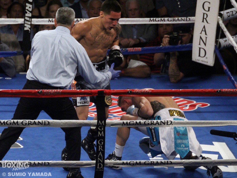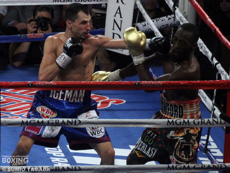 右構えでスタートしたクロフォードに対し、長身のポストルが圧力をかけて出る。1分経たないうちにサウスポーにチェンジしたクロフォードは左右に動きながら右ジャブを浅く差し込んだ。2回終盤、クロフォードが左を軽くヒットして優勢を印象づけた。圧力をかけながら前に出るポストル、サークルしながら距離とタイミングを計るクロフォードという展開のなか、3回終盤には今度はポストルが得意の右を当てた。4回、クロフォードの左が2度ほどWBC王者の顔面をかすめると一気に場内はヒートアップしたが、長続きはしなかった。5回、開始と同時にクロフォードの右フックが当たりポストルが右膝をつくダウンを喫した。再開から1分ほど、今度はクロフォードが左を直撃。大きくバランスを崩したポストルは2度目のダウンを喫した。